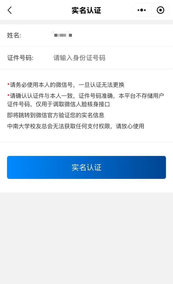(2)点击注册,完成实名认证后,按步骤填写相关信息,提交信息后即可登录校友平台(留学生因无身份证件需通过班级链接注册);