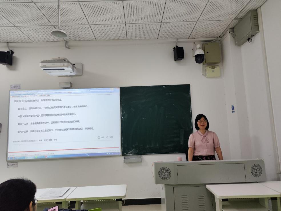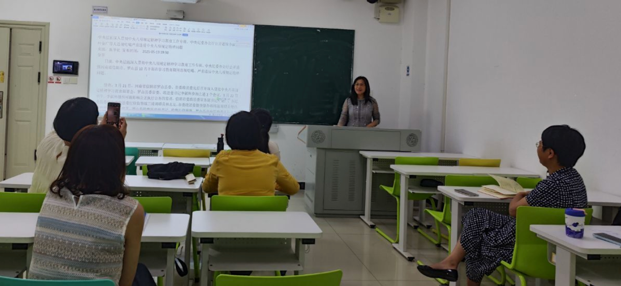 2025年6月4日,教工第三党支部在外语楼107召开全体党员会议,开展了一场主题鲜明、内容丰富的党课学习活动。本次党课由支部书记傅晓燕主讲,全体党员教师积极参与,深入学习中央八项规定及其实施细则精神内涵,进一步强化党性修养和纪律意识。