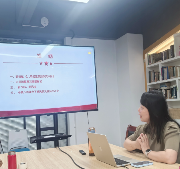 罗治荣以梁相斌著作《八项规定深刻改变中国》为蓝本,为支部党员讲授了一堂题为“严守八项规定,锤炼党性作风”的专题党课,聚焦作风建设在基层教学科研单位落地生根,通过书中鲜活案例与教师身边实例对照剖析,引导党员教师深学细悟、对标检视。罗治荣带领党员同志精读了著作的部分典型案例,重点解读与高校教师工作生活联系密切的场景。
